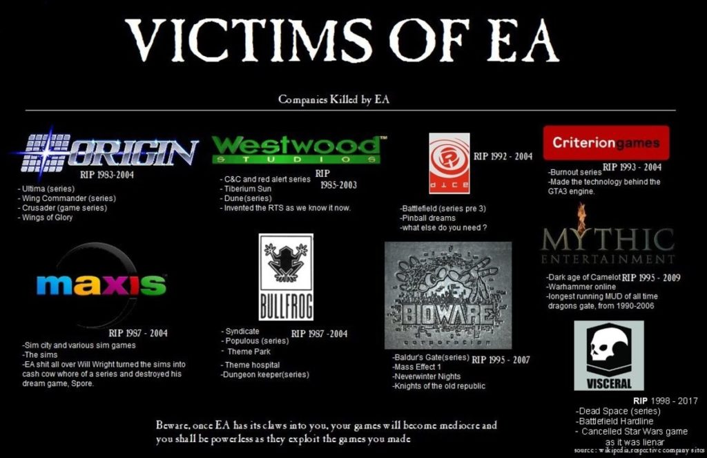 Questi sono solo alcuni tra gli studio ad aver ricevuto il trattamento EA. Purtroppo la lista è ben più lunga: Westwood Studios, creatori di Command & Conquer, acquisiti nel 1998 e chiusi nel 2003; Mythic Entertainment, sviluppatori di Dark Age of Camelot e Warhammer Online: Age of Reckoning, acquisiti nel 2006 e chiusi nel 2014; Maxis, creatori di The Sims, acquisiti nel 1997 e chiusi nel 2004; Pandemic Studios, creatori della serie di Star Wars Battlefront, acquisiti nel 2008 e chiusi l’anno successivo; Dreamworks Interactive, creatori di Medal Of Honor, reintegrati in DICE Los Angeles nel 2013.
