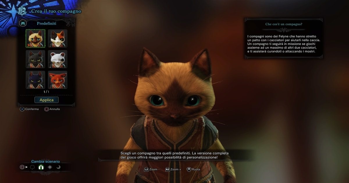 Come preannunciato da Capcom, una volta arrivati al menu di apertura, il gioco ci chiede di scegliere il nostro cacciatore. In occasione della beta, sono stati resi disponibili ben 12 modelli preimpostati di cacciatori, di cui sei tipologie maschili ed altrettante controparti femminili. Siccome si tratta di una versione di prova del gioco, non è stato possibile inserire altre possibilità di personalizzazione del personaggio, che però, Capcom assicura, saranno presenti nella versione definitiva di Monster Hunter: World. Dopo aver scelto il nostro cacciatore, il gioco ci fa fare altrettanto con il nostro fido Felyne, di cui saranno disponibili sempre sei modelli.