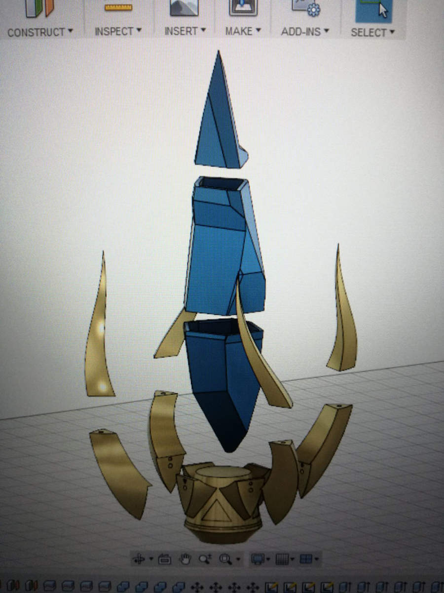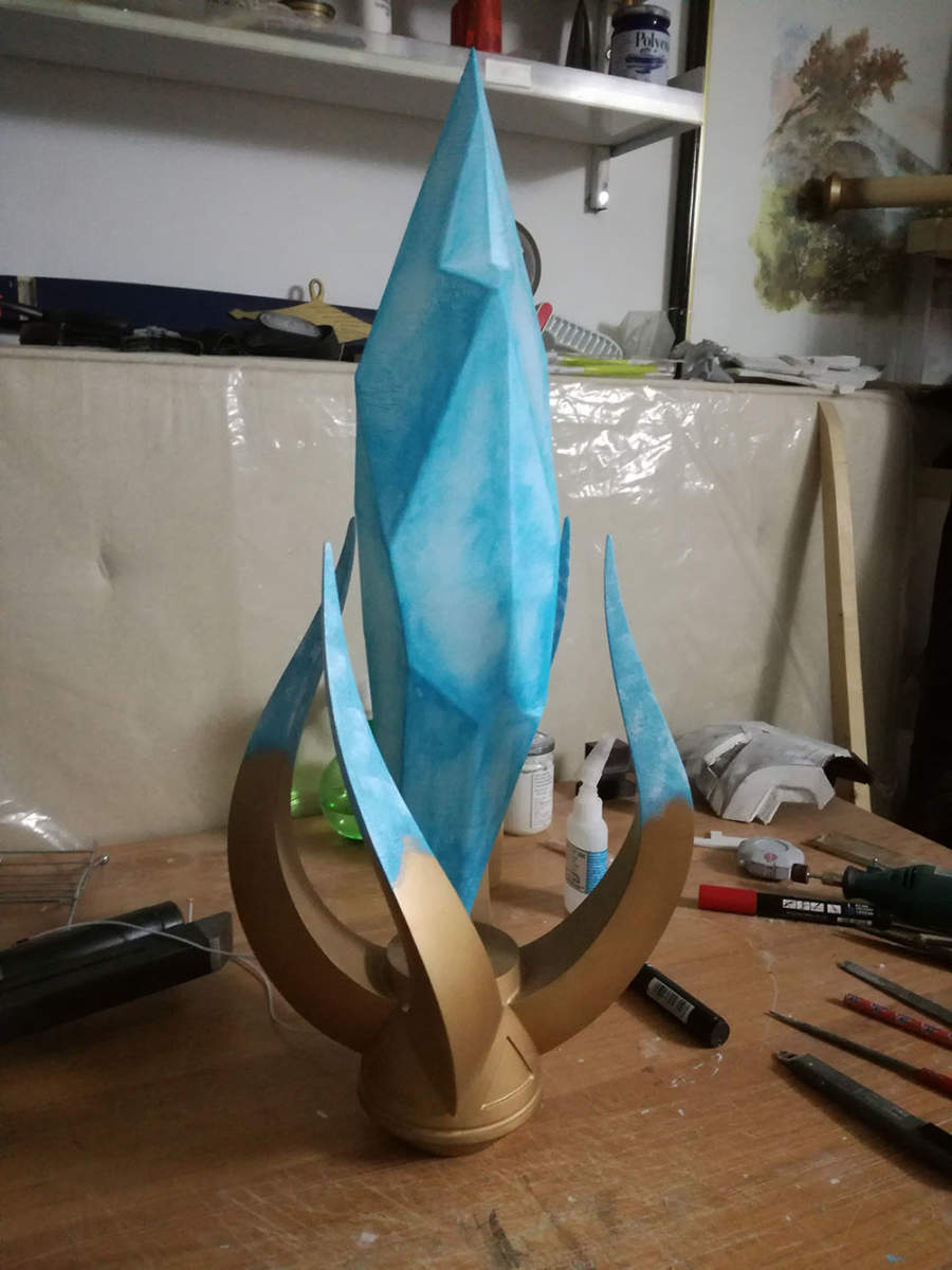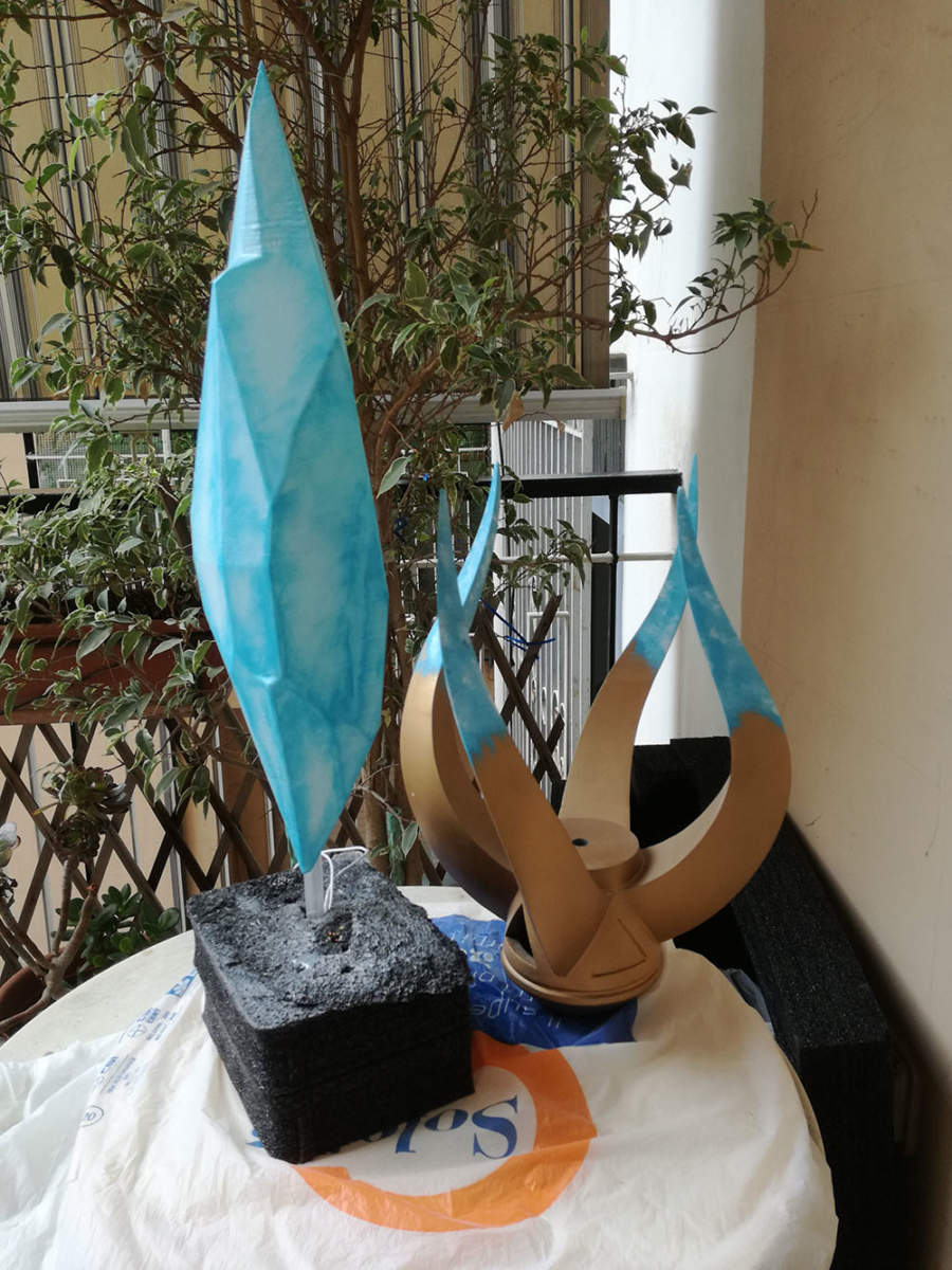 Finita la fase di modellazione e stampa si passa alla levigatura, questa parte è forse la più impegnativa in quanto bisogna levigare a mano ogni pezzo per ottenere una superficie quanto più liscia possibile. Si arriva poi alla colorazione: Per i pezzi “metallici” sono stati usati primer, nero base, due tonalità di oro e protettivo trasparente mentre per le gemme si è optato per una colorazione a spugna con colori acrilici in barattolo per ottenere la giusta diffusione della luce una volta installati i led.