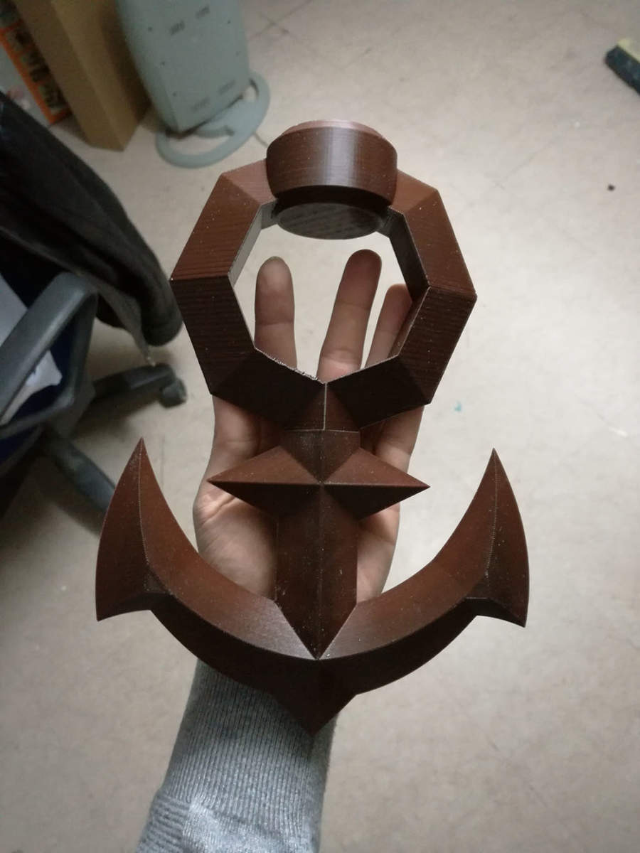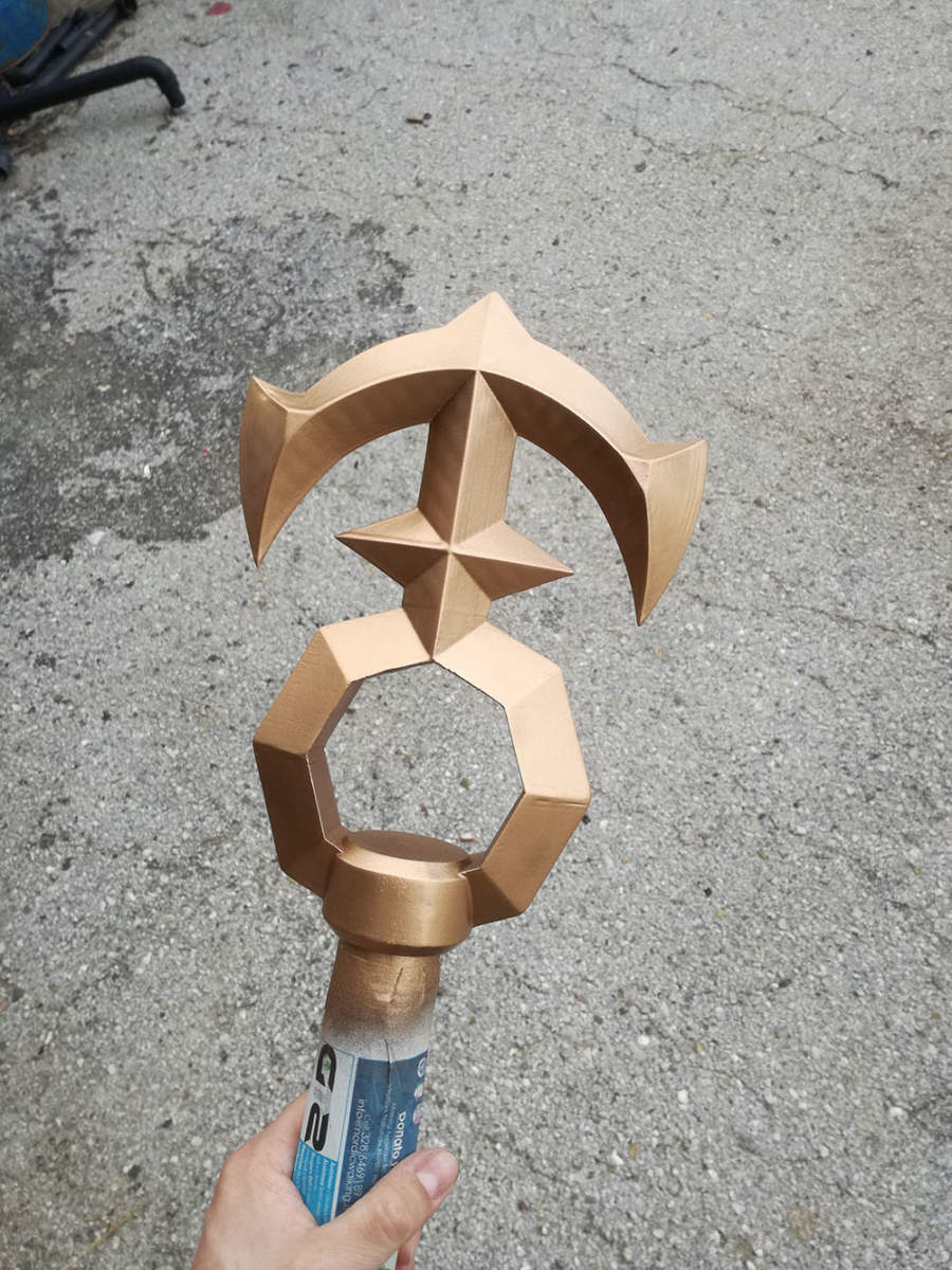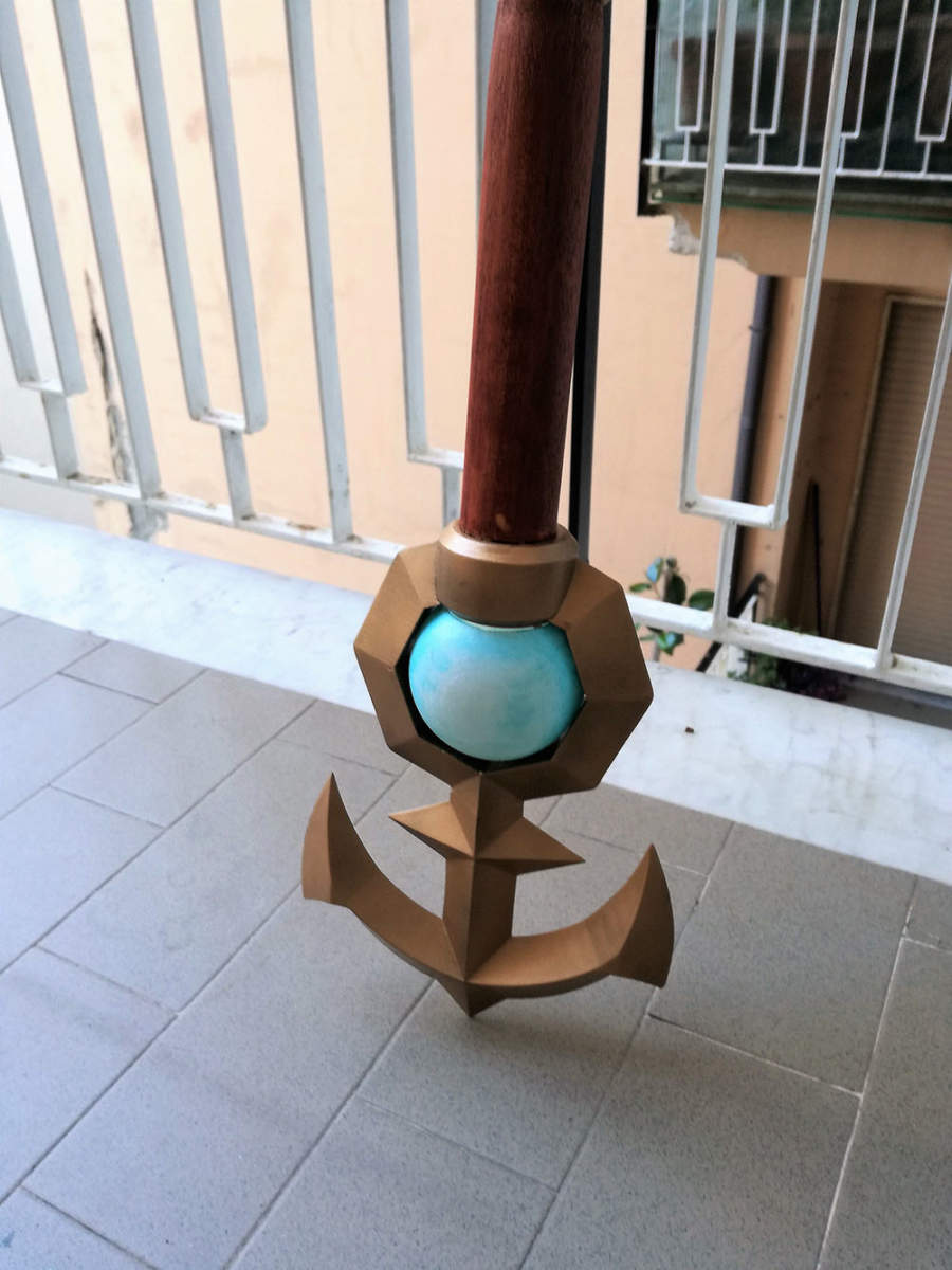 Tenendo conto della forma, delle dimensioni e della presenza di un cristallo luminoso la decisione è stata semplice, modellare e stampare in 3D i diversi componenti da assemblare poi su un bastone in legno opportunamente lavorato.