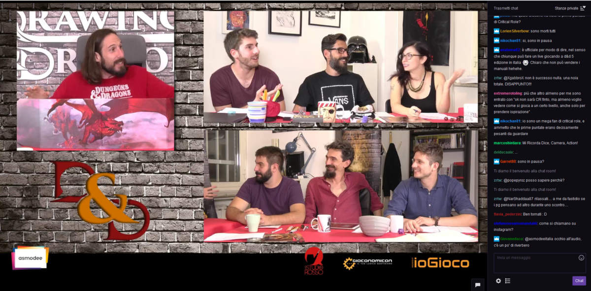 Quindi, grazie al successo in terra nostrana dell’ultima edizione di Dungeons & Dragons (Asmodee ha previsto diecimila copie vendute entro la fine dell’anno del solo Manuale del Giocatore), era inevitabile che anche l’editore italiano decidesse di intraprendere un’iniziativa simile a quella della “casa madre”. Al via, quindi, Drawings & Dragons, il primo actual play in onda sul neonato canale Twitch di Asmodee Italia, e da essa patrocinato ovviamente.