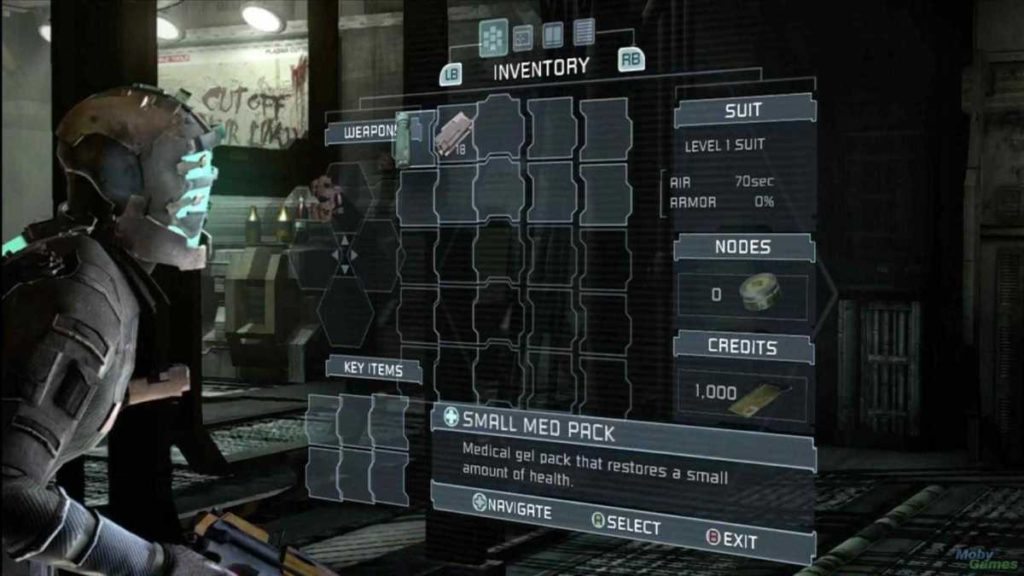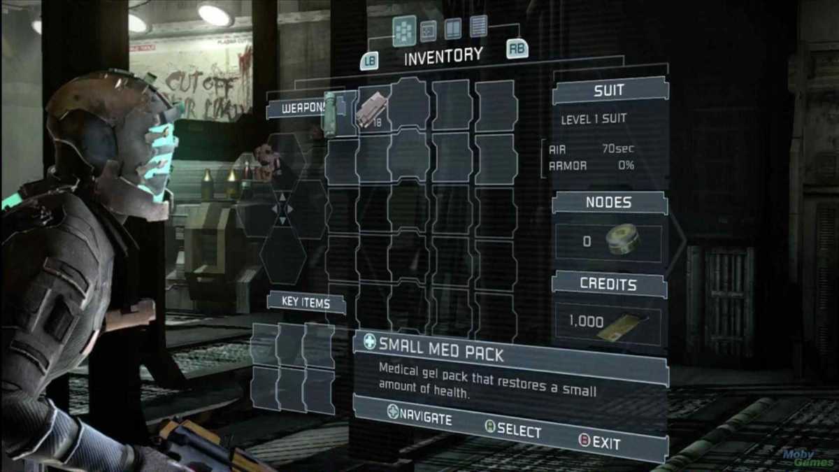 All’interno di Dead Space tale quarta parete viene mantenuta intatta da sistema di menù interni al mondo di gioco tanto semplice quanto elegante.