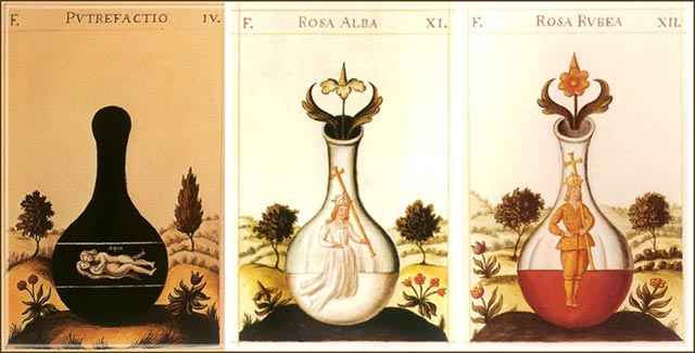 - Nigredo (color nero), in cui gli ingredienti alchemici vengono trasformati in una materia nera e uniforme;