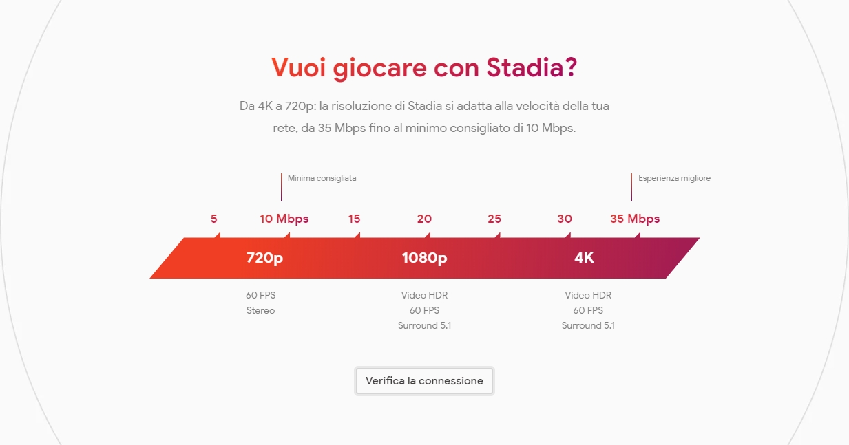 Una delle domande più importanti che sono sorte durante la presentazione della nuova piattaforma di Google riguarda la potenza della connessione necessaria al funzionamento del tutto. Secondo quanto dichiarato da Phil Harrison nella sua intervista a Kotaku, il requisito minimo da rispettare per ottenere una risoluzione 1080p a 60 frame al secondo è una connessione con velocità 25 megabits al secondo.