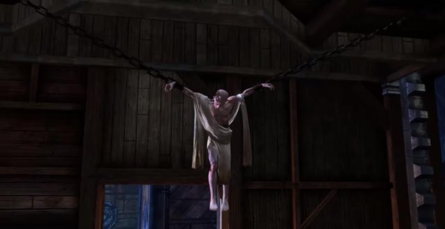 Un Dedalo incatenato nel suo stesso labirinto da Zeus, dopo l’apertura del Vaso di Pandora (again). Dedalo è inizialmente ignaro della dipartita del figlio Icaro, avvenuta per mano di Kratos in God of War II, ma quando ci vede con le sue ali capisce immediatamente, e gli si spezza il cuore.