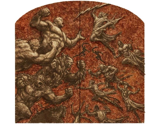 Il primo mostra la Titanomachia, non sappiamo se la prima (quella originale) o la seconda (quella provocata da Kratos), con due figure, in ombra e più piccole delle altre, che si affrontano in combattimento (forse erano Kratos e Deimos, in origine?).