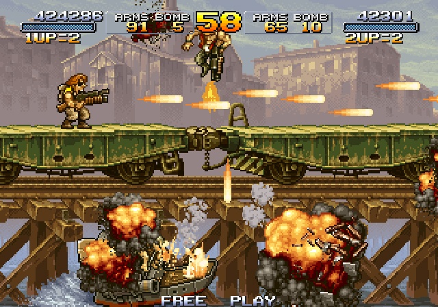 Sù per giù era il 2003, avevo 10 anni e la mia famiglia portò me e mia sorella in un bellissimo camping sul Gargano in Puglia. Fortunatamente una volta sistemata la roulotte e scaricata la bici, essendo sempre stato un bambino autonomo, mi lasciarono andare ad esplorare il villaggio: spiaggia, piazzetta, anfiteatro ma soprattutto la sala giochi, un luogo di perdizione mistica in cui inconsapevolmente i bambini che rifiutavano i dogmi della Baby Dance spendevano metà del budget familiare per la vacanza. Ora chiariamoci, si trattava giusto di 5/6 cabinati e un flipper messi in fila sotto una tettoia ma ce lo facevamo bastare: tra un Virtua Tennis e un Puzzle Bubble c’era lui, Metal Slug. Non so esattamente cosa mi attirò principalmente, se la grafica cartoon o le musiche o la voce che dagli altoparlanti gridava “HEAVY MACHINE GUN!”, ma ciò che era sicuro che quel cabinato non aveva attirato solo me ma anche tantissimi altri ragazzini che facevano la fila per poter tentare di inserire le proprie tre lettere nella scoreboard.