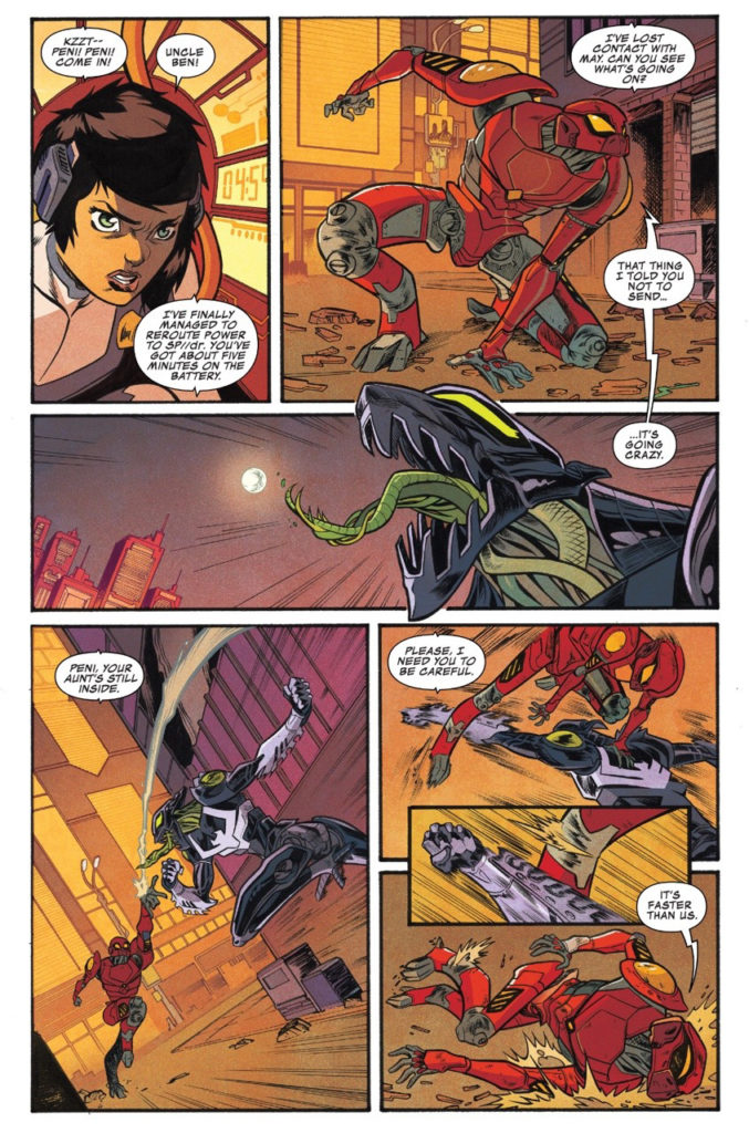 Qui la storia viene completamente stravolta dal canone classico: La città di New York è protetta da SP//dr, un mech pilotato da un umano ed un ragno radioattivo in collegamento telepatico. Il pilota in questione è inizialmente il padre di Peni che scompare in circostanze misteriose, ecco allora che la nostra protagonista viene avvicinata da zio Ben e zia May che la informano che solo lei può pilotare lo SP//dr grazie al suo corredo genetico dopo essere stata morsa dello stesso ragno. Diventerà quindi lei la protettrice della città fino a scontrarsi con l’unità VEN#m (e forse pure qualche Apostolo).