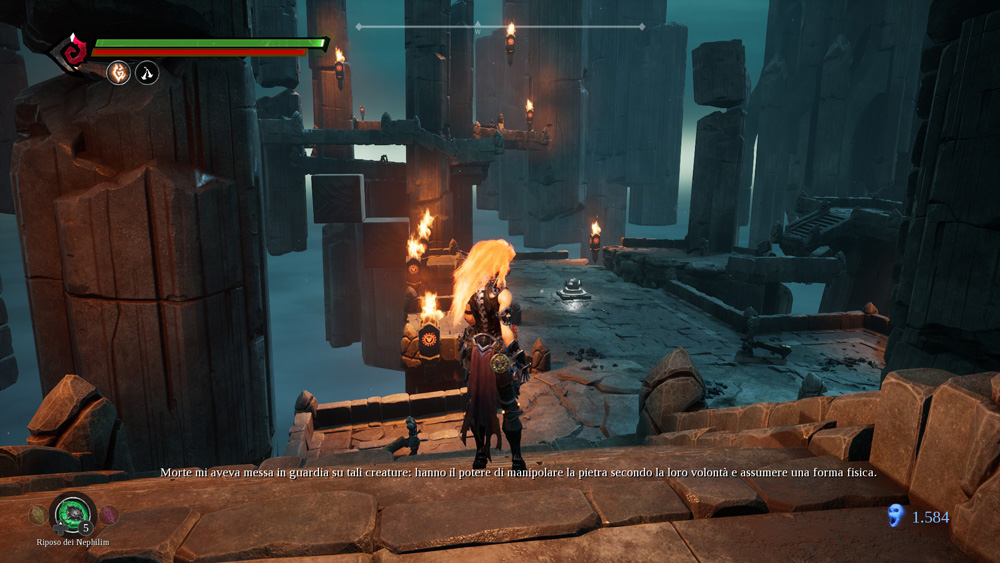Il level design è sicuramente degno di nota: I movimenti lenti dei componenti dei diversi puzzle e la stoicità dei mostri presenti ci trasporteranno in un luogo completamente slegato dall’erosione del tempo. Nonostante si tratti letteralmente di stanze sospese nel vuoto, la freddezza delle pareti di pietra e la scala di grigi contrastata dalle note di colore dell’elemento corrispondente riescono a creare un ambiente suggestivo che trasmette perfettamente il senso di vacuità al giocatore.