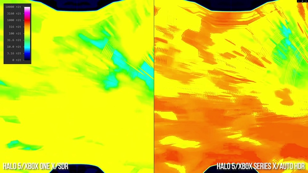 La prova in video è lapalissiana, grazie anche all’aiuto di una heatmap, e mostra Halo 5 (uscito nel 2016) e Fusion Frenzy (uscito nel 2002), entrambi in HDR e in risoluzione 4K.