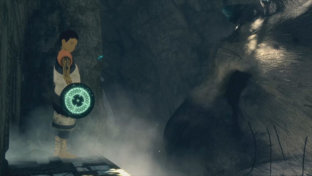 Dunque dove si colloca temporalmente la narrativa di gioco? In base a tutto ciò che è stato detto, le vicende di The Last Guardian non possono che avvenire prima di quelle di Shadow of The Colossus. Ciò sia per lo stato di conservazione delle strutture e degli edifici che incontriamo in TLG, assai più integri delle rovine di SotC, sia per il fatto che Dormin è annientato alla fine di quest’ultimo. Ci sono poi altri fattori che finora non abbiamo considerato: in TLG non c’è traccia di bambini con le corna, né è in alcun modo menzionata una maledizione. Inoltre, gli uomini non sembrano essere mai entrati in contatto con alcuna forma di magia, cosa che avviene per la prima volta al termine del gioco, con il ritrovamento dello scudo. Noi giocatori siamo a quel punto consci che la “magia bianca” non è altro che una forma di energia sintetizzata dai macchinari del Nido. Ma è evidente che i personaggi del gioco non sono in grado di capire tutto ciò, e agli occhi loro e del protagonista i poteri misteriosi dello scudo e delle strutture artificiali incontrate non possono che essere magici.