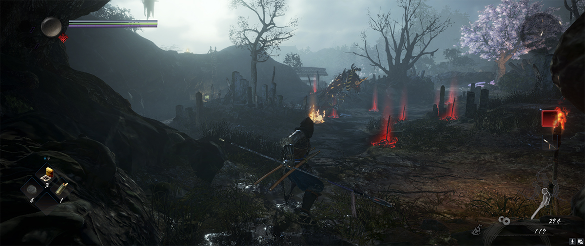 Al posto dei falò di Dark Souls ci sono dei santuari, e al posto delle anime ci sono le Amrita: le Amrita sono necessarie ad aumentare le abilità del giocatore, ma ad ogni morte si perdono e si respawna all’ultimo tempietto dove ci si è fermati a pregare. Anche i combattimenti sono tosti come dovrebbe essere un soulslike con l’aggiunta di poter cambiare il modo di impugnare le armi.
