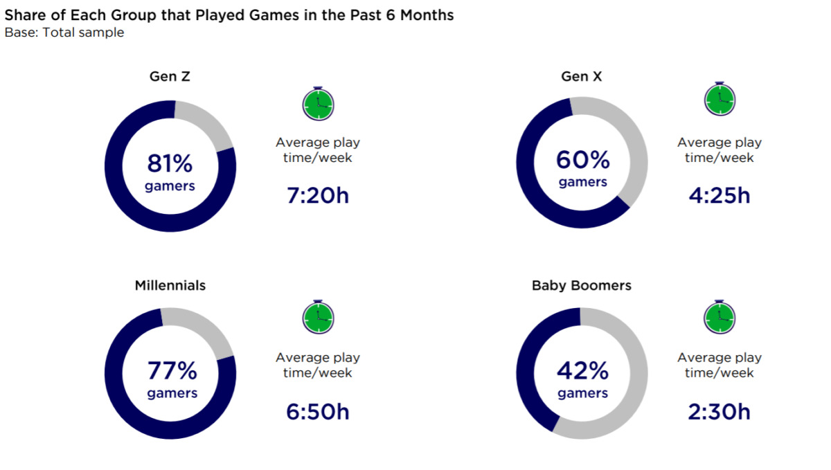 Dalle cifre qui esposte saremmo tentati di concludere che la maggior parte delle persone tra i 10 e i 65 anni sia videogiocante, ma non cadiamo in questo errore: i campioni intervistati per queste analisi non sono uniformi dal punto di vista quantitativo, le generazioni più giovani constano di un campione sensibilmente più grande di Gen X e Baby Boomers. Vi rimando al report completo qualora voleste approfondire questi aspetti numerici. In ogni caso, se vostro figlio non vi risponde al telefono, non preoccupatevi troppo, è probabile che stia giocando: la Gen Z spende più di un’ora al giorno di media in compagnia dei videogiochi.