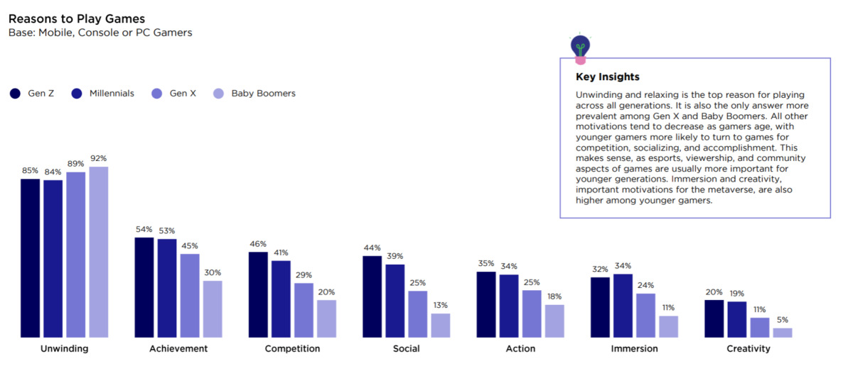 Come si vede, non mancano motivazioni ulteriori che spingano la gente a videogiocare, tra cui spiccano, tra Gen Z e Millennials, la soddisfazione per il raggiungimento degli obbiettivi e lo spirito competitivo. Il che spiega tra l’altro perché il gaming multiplayer sia tanto diffuso tra i più giovani. Gen X e Baby Boomers invece sono meno inclini a giocare per altre motivazioni che non siano l’evasione pura, ed in generale sono una minoranza i videogiocatori che cercano nel medium un catalizzatore per esprimere la propria creatività (minoranza comunque rumorosa, a giudicare dal successo strepitoso di Minecraft e dei sandbox in generale).