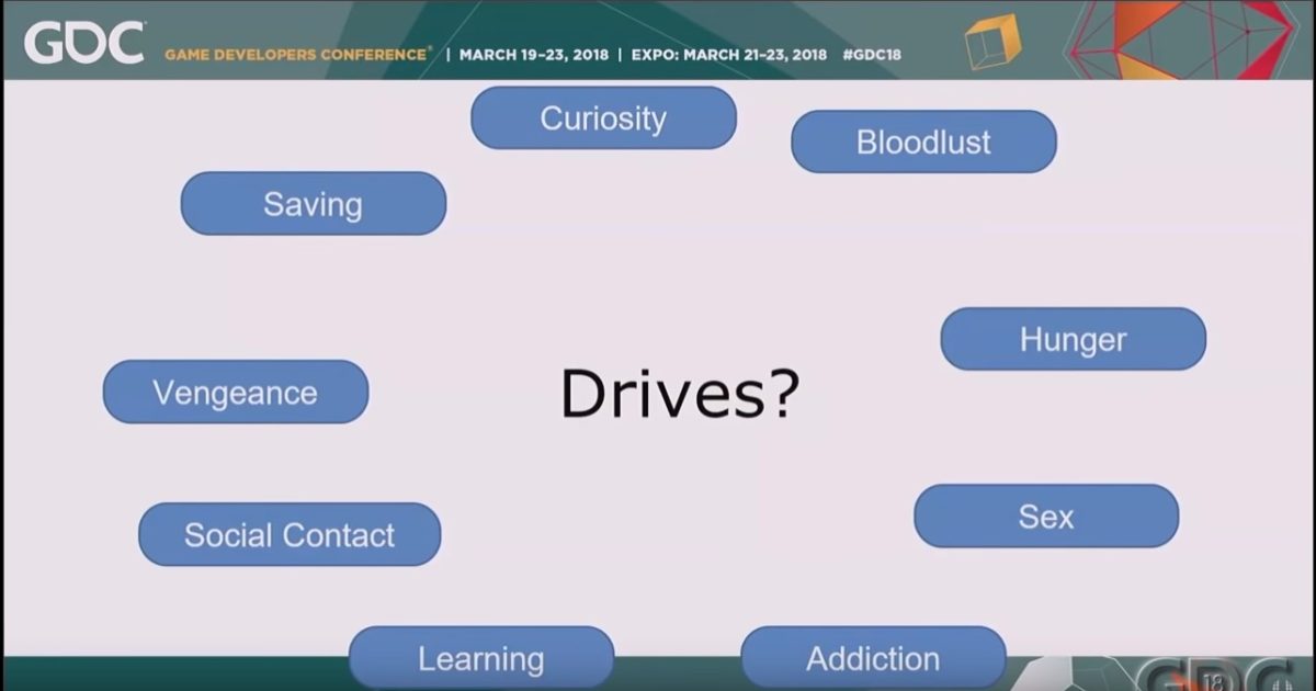 La soluzione arriva nel talk successivo nei Drives, in Italiano traducibili in Pulsioni o Impulsi. Jason VandenBerghe osserva che quando i videogiocatori giocano, questi tendano ad avere simili comportamenti e a essere guidati da impulsi simili.
