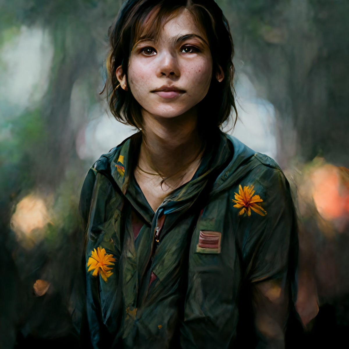 Midjourney ci ha restituito una versione orientale della Ellie che siamo abituati a conoscere. È persa in un bosco sfocato, uno dei tanti che ha attraversato durante la sua vita. Gli abiti sono quelli rimediati in un negozio abbandonato e la stanchezza che le pesa sul volto è quella che solo la lotta per la sopravvivenza infligge. Sul suo viso però non c’è solo quella, ma anche un flebile sorriso. Una luce di speranza rivolta al domani.