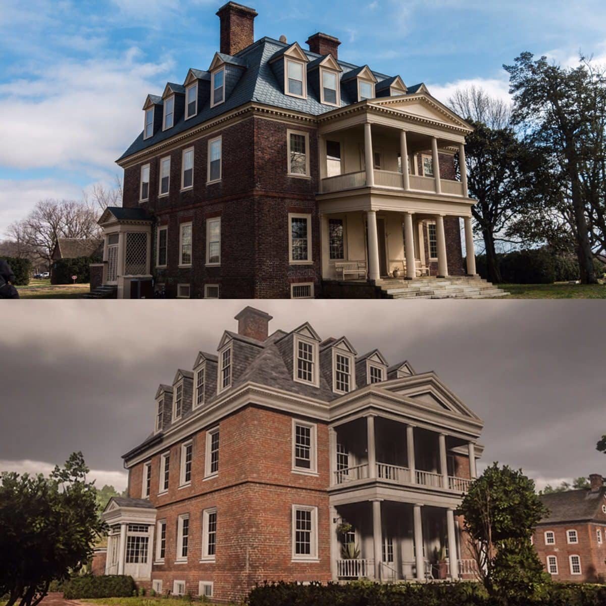 Oltre alla facciata quasi identica, è possibile notare delle forti somiglianza con l’entrata frontale e gli edifici minori che circondano la villa. Inoltre, entrambe le piantagioni si affacciano sulla riva di un fiume: Caliga Hall verso il fiume Kamassa e Shirley Plantation verso il fiume James.