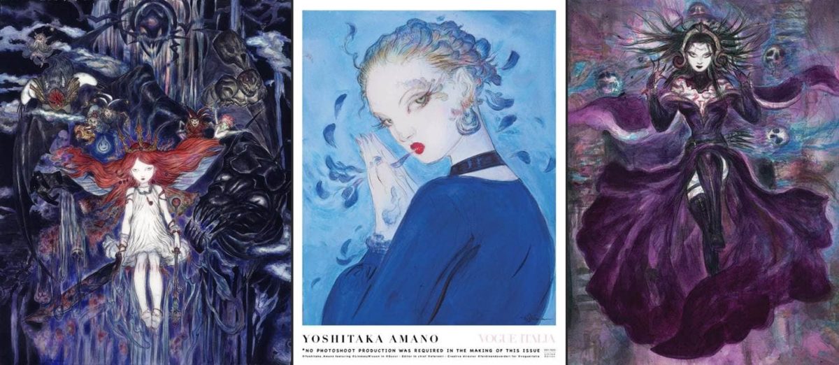 Perdersi negli artwork creati da Amano per FF è un viaggio verso un mondo onirico e sfuggente, dalle atmosfere memorabili. I personaggi che vivono nei suoi fogli sono spesso pallidi e spettrali, con capelli fluenti e fluttuanti. I lineamenti sono androgini e lo sguardo è sempre intenso, mentre le labbra sono spesso nere e serrate, oppure contratte in un misterioso sorriso alla Mona Lisa.