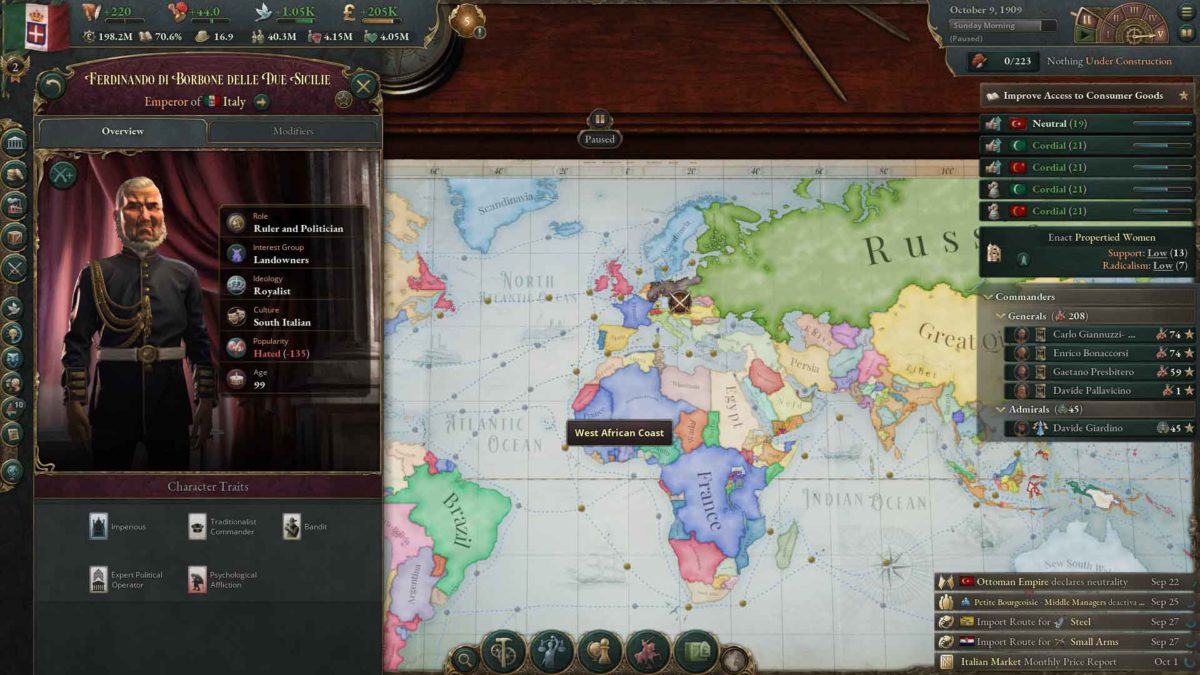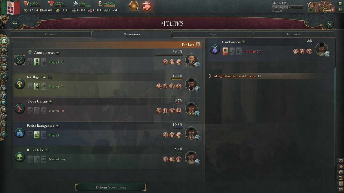 Tutto questo fa estremamente contenta “l’intelligentsia” del paese. In Victoria 3 le fazioni influenti possono donare alla nazione bonus o malus al paese in base alla loro contentezza con le leggi e la situazione dello stato. Alla fine del ventennio di riforme, gli intellettuali, estremamente contenti, mi donarono un bonus di migrazione. Un misero 10% che avrebbe catapultato però le Due Sicilie, e l’Italia intera, in una età dell’oro che non abbiamo mai avuto (e non sono sicuro che meritiamo).
