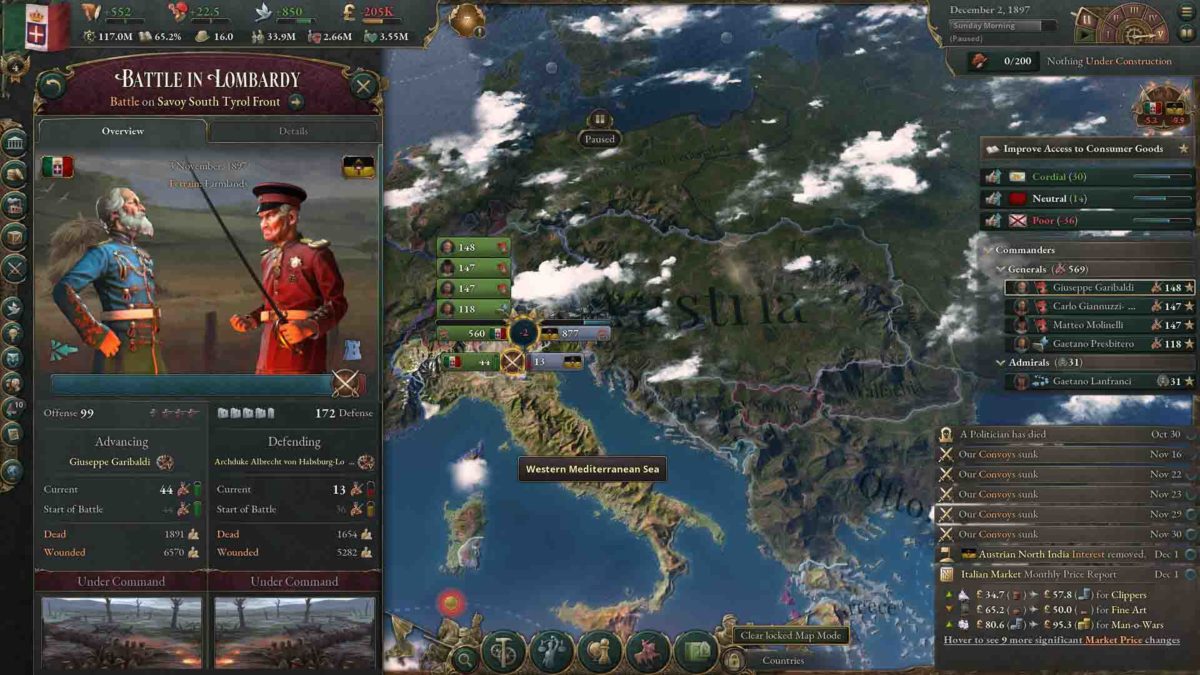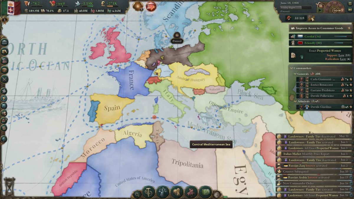 Di lì a pochi anni la crescita dovuta all’immigrazione è così elevata da portare un aumento del PIL quasi dell’150% in 40 anni, alla fine dei quali, superando l’Austria in diversi campi invado finalmente i territori che mi spettano, combattendo da solo contro Russia Austria e Ottomani (una specie di prima guerra mondiale ma da 1v3) e vincendo, coniando la fine del Risorgimento.