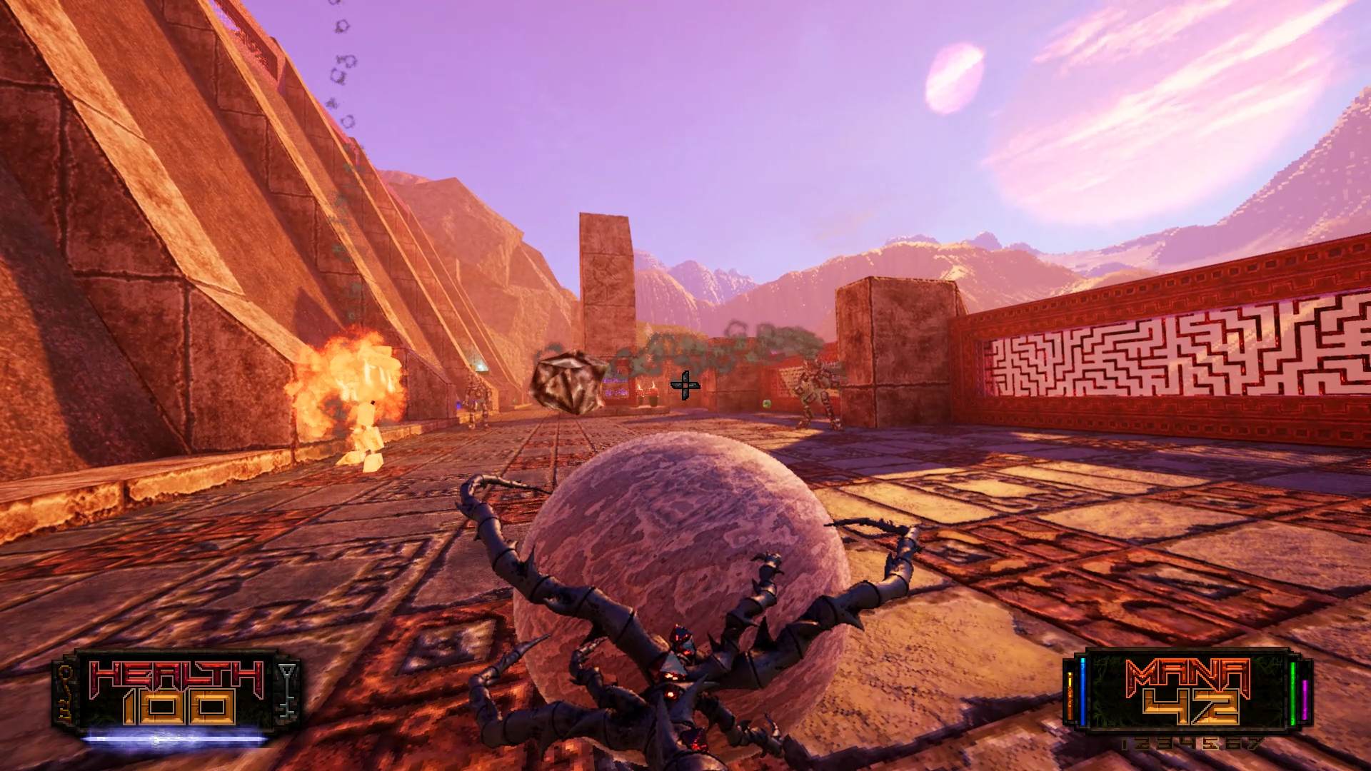 Invece che utilizzare fucili, pistole, mitragliatori, lanciarazzi e compagnia, Amid Evil da al giocatore l’accesso ad un comparto magico vario abbastanza da generare morte e distruzioni in maniere sempre nuove. Il lanciagranate di questo gioco, per capirci, non fa altro che comprimere pianeti per poi lanciarli a tutta velocità verso il nemico. L’ispirazione, in questo caso, è abbastanza chiara: Heretic, Hexen, Hexen 2 e parzialmente anche Heretic 2: niente armi tradizionali ma soltanto magie, magie e altre magie.
