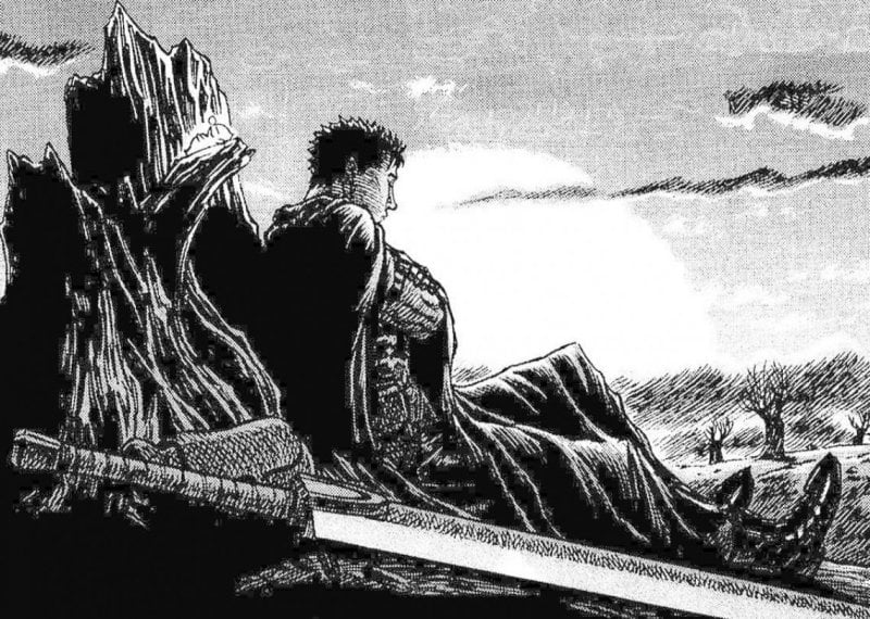 Gatsu è un uomo ormai finito (ed è inevitabile non pensare alla profezia che, molto tempo prima, Zodd aveva recitato a Gatsu, riferendosi alla metamorfosi che Grifis avrebbe affrontato quando tutti suoi sogni sarebbero stati negati), non più in grado di proteggere la sua amata, non più in grado di proteggere i suoi amici, non più in grado di sollevare la sua spada, la sua più cara amica. Inoltre, è ormai fisicamente distrutto dall’utilizzo intensivo dell’armatura del Berserker e dopo l’ultimo incontro con Grifis, si è anche reso conto di quanto la sua forza sovrumana, non sia nulla di fronte a un membro della Mano di Dio.