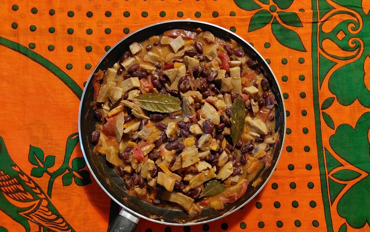 Ah. Il ballottaggio con un piatto coreano è presto vinto, ed ecco che dopo il gazpacho il menu presenterà un piattone unico, quasi un pasto completo. Carote cipolla e aglio ad appassire in padella, presto si unisce il protagonista più atteso, il seitan, sul quale graverà la responsabilità di sostituire la carne, qualche cucchiaio di farina, il bagnare dei pomodori, mi prendo una licenza culinaria e invece del vino uso la birra sfumare, allungo col brodo, poi è il momento dell’elisir di lunga vita dei vegani ossia i legumi (fagioli in questo caso), infine alloro, paprika e la seconda licenza quando invece del peperoncino di cayenna uso un olio piccante fatto in casa a Colonia Spiaggia (Teramo) dal mio amico Mauro, la piccantezza mi pervade il naso ma è perfetto perché intanto fuori ha iniziato a piovere.