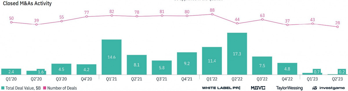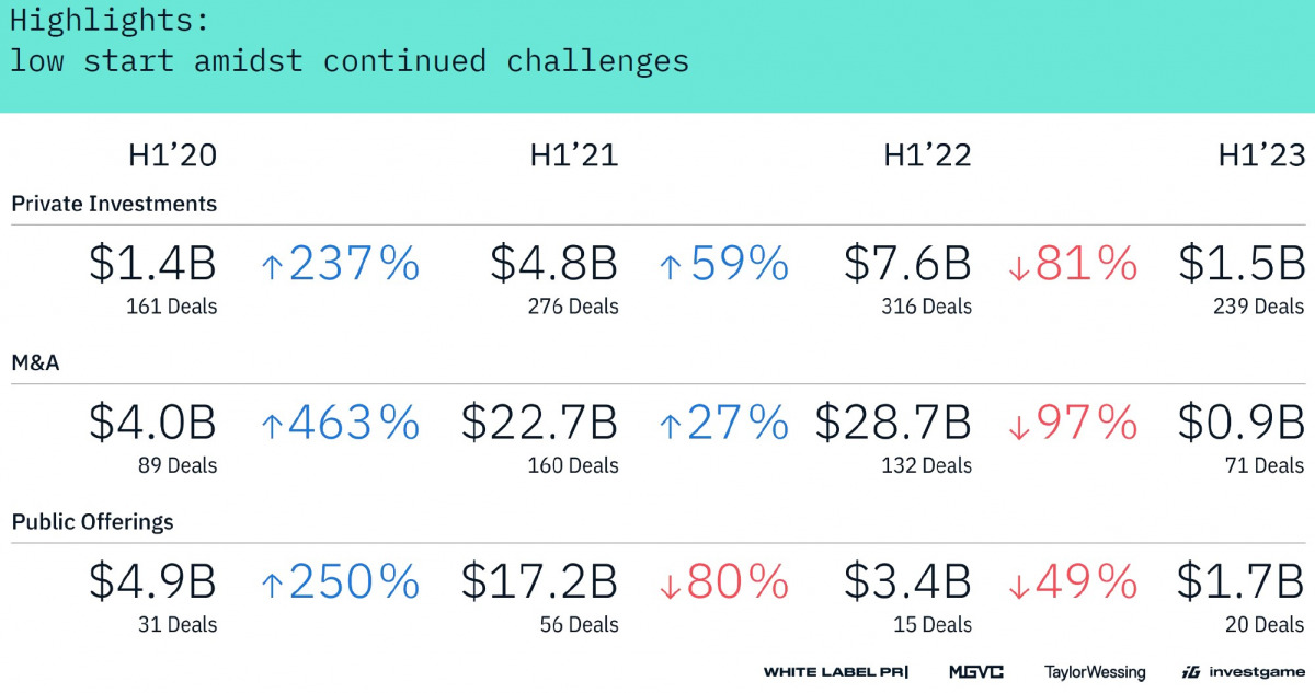 Volendo iniziare subito da una constatazione sintetica, bisogna dire che un po’ di movimento c’è stato, ma nulla rispetto agli anni immediatamente precedenti, quando finanziamenti pubblici (intesi come vendita pubblica di quote sui mercati azionari) e fondi privati avevano scommesso cifre molto più importanti nel mercato videoludico. Nei primi 6 mesi del 2023 sono stati conclusi 330 accordi per un giro d’affari totale di 4.1 miliardi di dollari, briciole rispetto ai 39,7 miliardi dell’H1 2022.