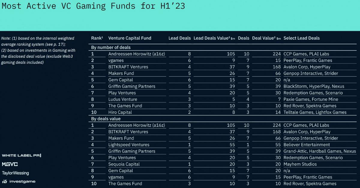 In ogni caso, InvestGame ha stilato una classifica dei venture capitalist più performanti in termini di soldi investiti e quantità di progetti finanziati. In prima posizione, per entrambe le categoria, spicca Andreessen Horowitz, fondo di investimenti californiano specializzato nel segmento dei social network ma che ultimamente si è rivolto all’industria del gaming, in particolare investendo in Oculus Rift, e quest’anno nel team islandese CCP Games (al lavoro sullo storico MMO EVE Online) e in PLAI Labs, società che studia l’integrazione tra tecnologie AI, social network e videogiochi. Segue per entità degli investimenti, BITKRAFT Ventures, fondo specializzato in Esport e Web3, che quest’anno ha investito in Avalon Corp, società che specializzata nella creazione di metaversi, e HyperPlay, un launcher per giochi Web3 based.
