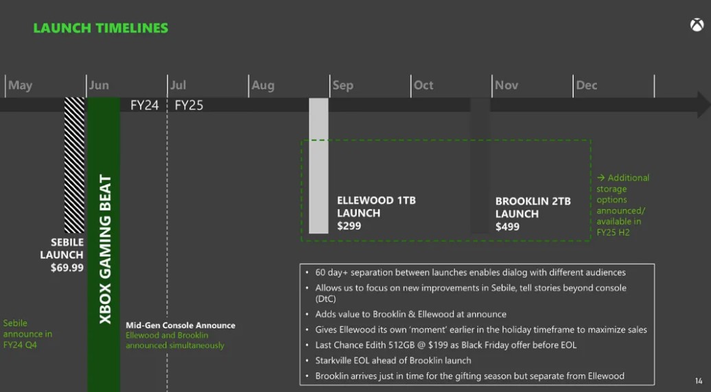 Nella strategia commerciale di Microsoft, visibile nell’ultima slide, compare la decisione di diluire gli annunci ufficiali delle due console lasciando 60 giorni di distanza tra di essi e dando priorità all’annuncio di Ellewood, per massimizzarne le vendite. Viene inoltre specificato che, nella seconda metà dell’anno fiscale 2025 saranno resi disponibili ulteriori tagli di memoria per entrambi i modelli. Si nota anche che il lancio di Sebile avverrà prima del rilascio delle nuove console, ergo sarà sicuramente retrocompatibile con gli attuali modelli.