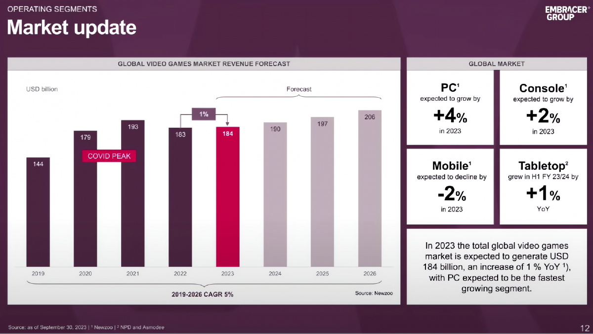 Insomma evidentemente in questo trimestre non è stato il segmento gaming a brillare nei risultati, anche a causa di uscite meno forti del trimestre appena trascorso, ma Embracer ha tenuto comunque botta grazie agli altri suoi settori di business. Ovviamente la contrazione del mercato gaming non aiuta a rilanciare le vendite, ma la prospettiva per il prossimo trienni è comunque positiva: le stime di Newzoo prevedono che entro il 2026 l’industria del gaming infrangerà il muro dei 200 miliardi di dollari di ricavi globali, lasciandosi così alle spalle questo momentaneo periodo di contrazione (che poi è comunque molto relativa; il gaming rimane comunque di gran lunga il settore dell’intrattenimento più lucroso di tutti e di sempre).