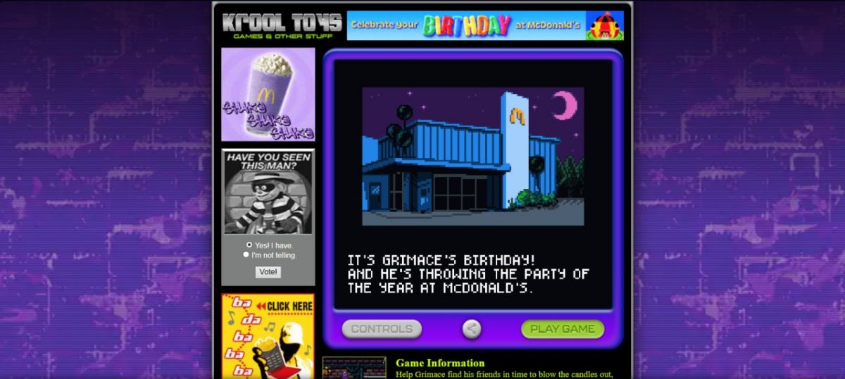 Qualche mese fa ha catturato la mia attenzione la notizia dell’uscita di un gioco free-to-play per Game Boy Color prodotto dalla catena di fast food, appunto. Un vassallo di Gunpei Yokoi come me ha immediatamente avvertito l’atto conoscitivo di provarlo, e il titolo in questione si intitola Grimace’s Birthday – disponibile anche per PC e smartphone.