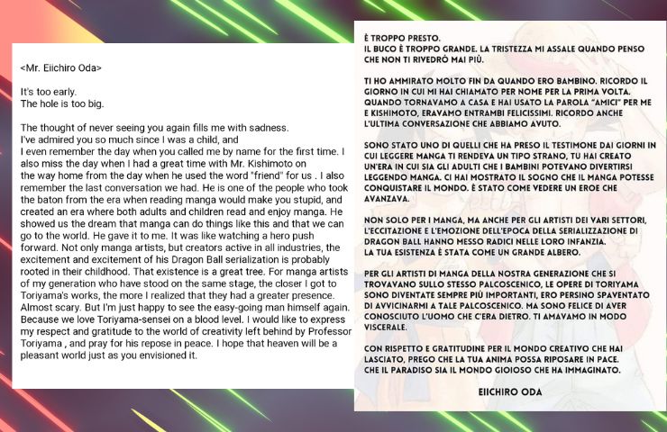 Questo è il messaggio di cordoglio di Eiichiro Oda, autore di One Piece: