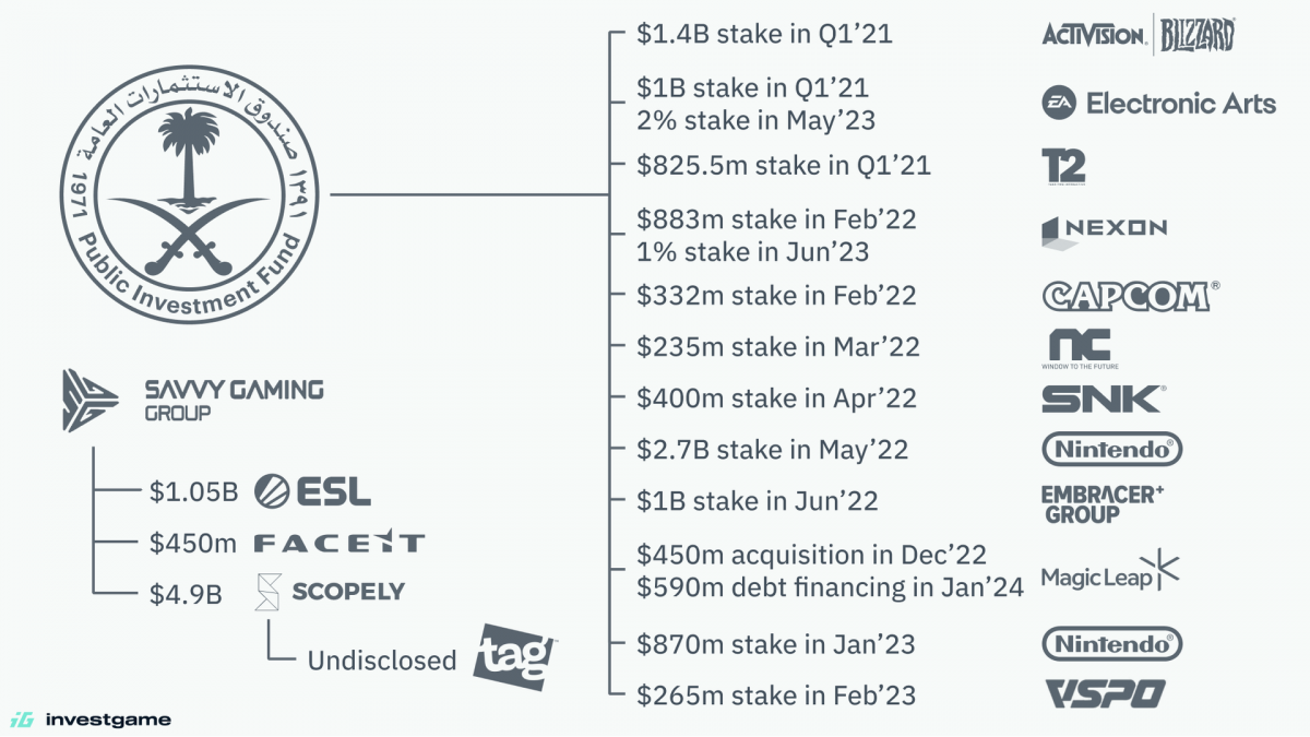 Il fondo d’investimento pubblico dell’Arabia Saudita, controllato direttamente dal principe Mohammed Bin Salman, ha investito enormemente nel settore gaming negli ultimi anni, e sembra determinato a continuare questa politica. Tramite la holding Savvy Games Group ha effettuato acquisizioni importanti in ambito Esport (acquisendo ESL e FACEIT, tra le principali società organizzatrici di eventi a tema) e mobile (acquisendo Scopely, uno dei maggiori sviluppatori e publisher americani del settore); inoltre nell’ultimo triennio ha acquisito pacchetti azionari di moltissime major, potendo vantare quote in Activision Blizzard, EA, Capcom, Embracer, Nintendo e altre (le vedete qui sopra).