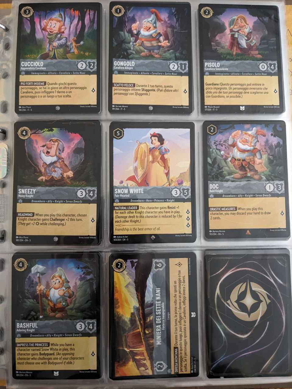 Biancaneve è ora un cavaliere e funziona in combo con i nuovi nani anch’essi cavalieri. La sua abilità le permette di ricevere Resistere +1 per ogni personaggio cavaliere in gioco. I nani, proprio come in passato, ricevono guardiano, aumenti di forza, infliggono danni ecc a seconda della presenza di Biancaneve, di altri cavalieri o di altri nani in campo. Gambadilegno – Arbitro di gioco invece blocca le azioni avversarie (e quindi anche le canzoni), fino all’inizio del prossimo turno. Giocato al momento fondamentale può davvero cambiare le sorti della partita.