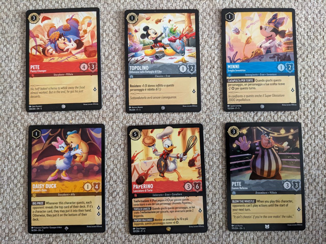 Insieme a lei, ad aver definito il meta di questa espansione, ci sono altre 2 carte Ambra: Paperina – Ragazza di Paperino, che costa un solo inchiostro, ha 2 leggende e l’abilità Primo Premio “Ogni volta che va all’avventura ogni avversario rivela la prima carta del mazzo. Se è una carta personaggio la aggiunge alla mano, altrimenti la mette in fondo al mazzo” e il Principe Naveen – Suonatore di Ukulele che in poco tempo è diventato una delle carte più desiderate del gioco per la sua abilità di poter giocare una canzone di costo 6 o inferiore gratis quando viene giocato. Oltretutto, pur costando 4 inchiostri, ha Melodioso 6 per cantare canzoni dal costo più elevato.