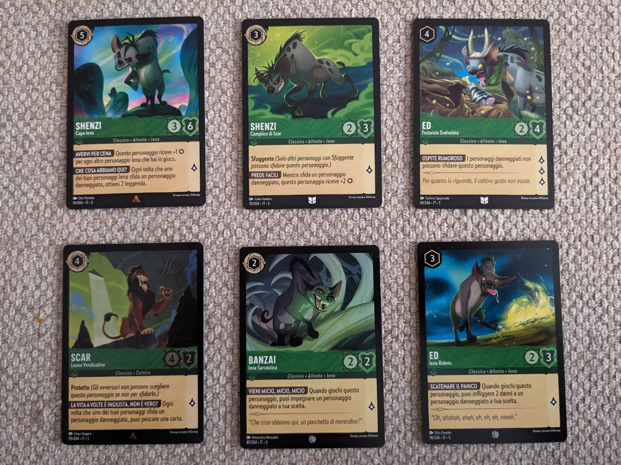 Tornando allo Smeraldo troviamo poi un intero set di carte dedicato alle iene del Re Leone che sono ottime da giocare in combo e le loro abilità ruotano tutte attorno ai personaggi danneggiati: più ce ne sono più si innescano effetti come potenziamenti di forza oppure immunità nelle sfide contro i personaggi danneggiati.