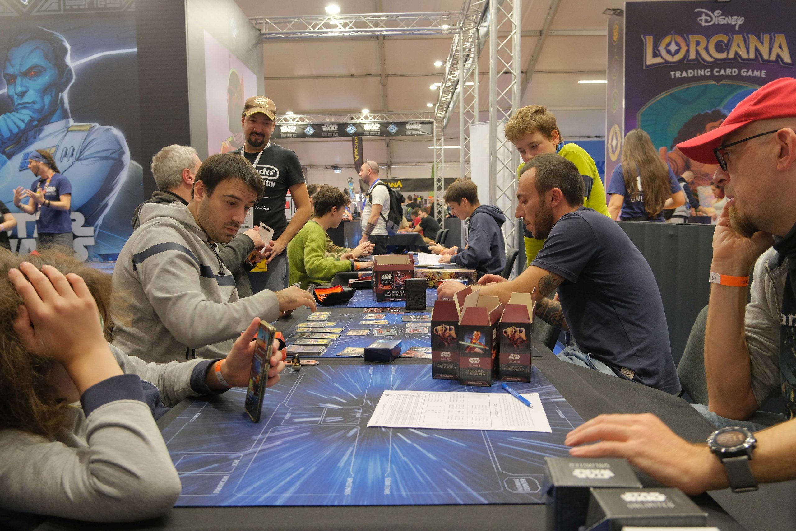 Il sottoscritto ha poi passato discreto tempo seduto ai tavoli di Lorcana giocando alla nuova tipologia di torneo denominata Pack Rush. Si tratta di mini tornei in cui si gioca utilizzando 2 soli pacchetti di carte (che venivano forniti all’iscrizione) e dove invece di 7 carte se ne pescano 5, dove si inchiostrano le carte di istruzioni trovate nei pacchetti (quindi si inizia con 2 inchiostri) e dove si arriva a 15 lore per vincere. La vittoria dei pack rush più piccoli erano delle carte promo, ma la cosa interessante era che questi tornei offrivano un pacchetto di Cieli Scintillanti, ultimo set di Lorcana in attesa di Mare di Azzurrite e uno del First Chapter, il tanto agognato primo set di Lorcana ora recuperabile solo a cifre importanti. I pack rush sono stati un vera ventata di aria fresca, diretti, veloci e in grado di insegnare, divertendo, le regole del gioco.