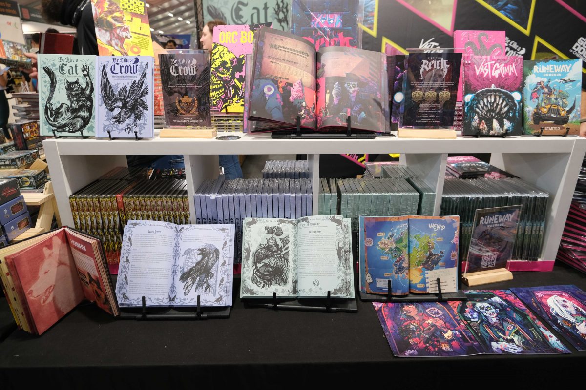 Siamo poi stati letteralmente rapiti dallo stand di Mana Project Studio, dal design dei loro giochi di ruolo (in particolare Eat the Reich che abbiamo recensito qui) e dai disegni di Runeway un GDR d’esplorazione presente in formato quickstart, ambientato nell’assurdo mondo di Weyrd e che funziona tramite un sistema basato sulle rune (anche in questo caso la nostra review è in arrivo!)