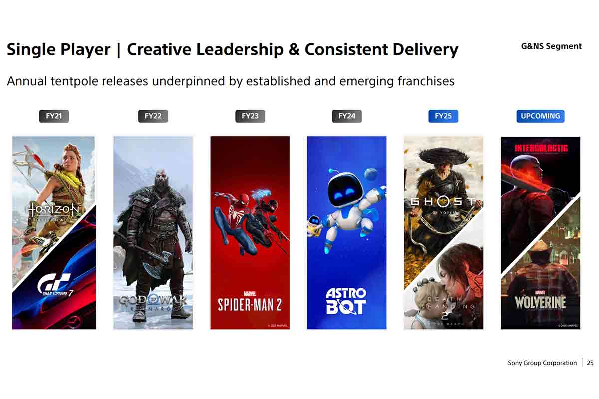 Da questo punto di vista bisogna augurarsi che SIE abbia imparato dai propri errori, e che tutti i progetti GaaS abortiti e/o floppati facciano riconsiderare la strategia verso una maggior valorizzazione delle esperienze per giocatore singolo che hanno fatto la forza e la fortuna di Playstation nelle passate generazioni, e che negli ultimi anni sono state rilasciate col contagocce, come si vede nella slide qui sotto.