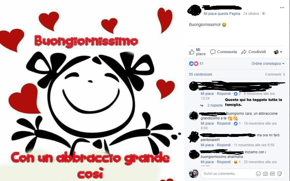 Vero, però, guarda caso, chi crede nei contenuti delle pagine che fanno largo uso di engagement bait è spesso anche chi augura il buongiornissimo ai propri cari. Un buon kaffèèè poi non manca mai, come se altre bevande non esistessero.