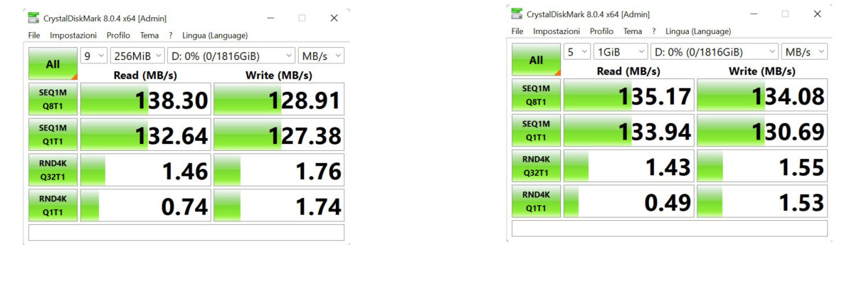 Con collegamento USB-A verso un PC Windows 11 ho ottenuto velocità medie in lettura/scrittura di circa 140/130 Mb/s che, con tutti i limiti dettati dalla tecnologia, rientrano a pieno nello standard dei dispositivi di archiviazione meccanica top di gamma.
