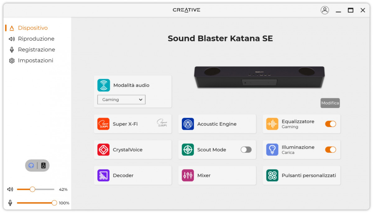Se sceglierete, come il sottoscritto, di collegare la Soundbar al PC, sarà praticamente obbligatorio installare l’app Creative (disponibile qui). Si tratta di un hub per il controllo di tutte le funzionalità della soundbar, dalle modalità di ascolto all’equalizzatore, passando per il controllo delle luci RGB e l’impostazione dei tasti programmabili del telecomando.