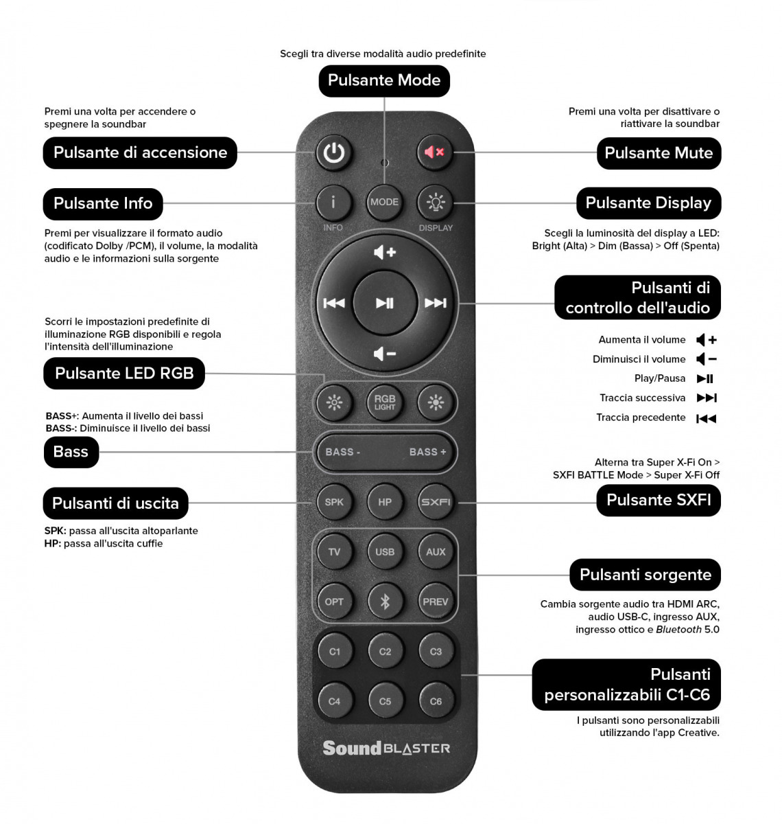 Sul lato superiore troviamo i due speaker principali accompagnati da 6 tasti rapidi molto comodi: Power/Bluetooth | Volume – | Volume + | Sorgente | Modalità | SXFI e frontalmente un ampio display lucido e un connettore rapido per le cuffie (anche con microfono).