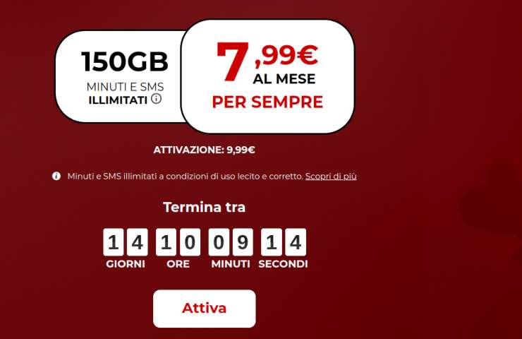 L’offerta comprende 150 GB di traffico internet da sfruttare in rete 4G e 4G + con in più minuti e sms illimitati da utilizzare a piacimento nel corso del mese. L’offerta è poi dotata di servizio mi richiami, la possibilità di utilizzare i propri dati in hotspot, un facile controllo del credito residuo ed è ideale per chi vuole cambiare operatore mantenendo il proprio numero di telefono.