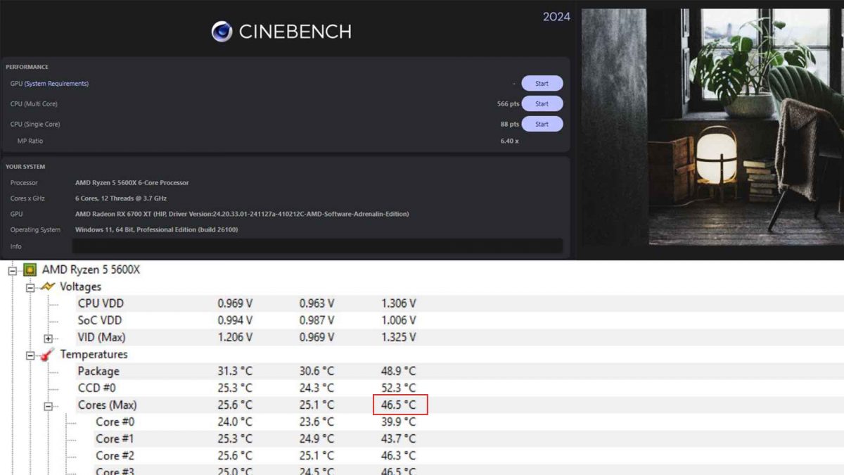 Abbiamo testato il dissipatore utilizzando un AMD Ryzen 5600X e sfruttando a nostro vantaggio lo stress test di Cinebench R24 per 10 minuti (tra le altre cose, registrando 566 punt in multi core e 88 in single core), misurando nel contempo le temperature. Le temperatura massima raggiunta dal processore è stata di 46.5° gradi centigradi, ben 15 in meno rispetto al normale funzionamento del computer che solitamente è raffreddato da un singolo Deepcool Gammaxx GTE V2.