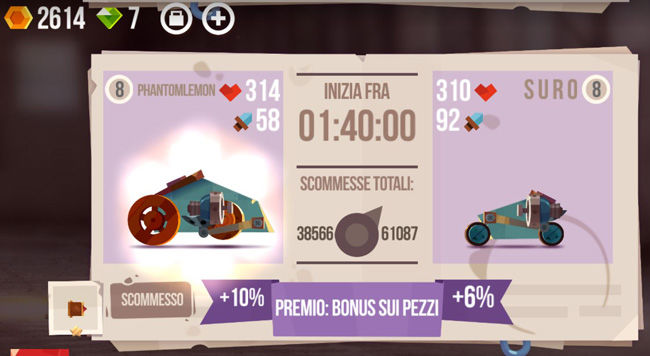 Molto interessante anche la modalità scommessa: guardando come sono due robot che stanno per combattere dovrete scommettere su quello che più probabilmente vincerà lo scontro. Per partecipare alla scommessa dovete puntare un pezzo dei vostri elementi di costruzione: una ruota, un razzo, un trapano ecc. Se vincete questo verrà potenziato della percentuale che vedete in fase di scommessa, se perdete, ahimè perderete il pezzo. Potete recuperarlo utilizzando un diamante, ma in questo gioco i diamanti sono merce rara quindi usateli con parsimonia. Consigli per affrontare la modalità scommesse: osservate bene i veicoli. Quali equipaggiamenti hanno, se sono soggetti a essere ribaltati dal veicolo che hanno contro e che velocità di camminamento hanno. Purtroppo questa modalità scommesse può essere giocata meglio quando conoscete il gioco da un pò. Per riconoscere infatti il tipo di equipaggiamento che montano i due robot e per fare quindi una previsione realistica dovete aver masticato alcune ore di gioco, aver visto qualche battaglia tra voi e gli altri concorrenti e sopratutto dovete sapere quali sono i pezzi che hanno i robot che stanno per scontrarsi altrimenti la vostra previsione di vittoria non potrà essere realistica.La percentuale che vedete vicino a ogni veicolo però può aiutarvi: quando piazzate una scommessa avrete la schermata come in foto qui sotto. La percentuale che vedete +6% e +10% sono il valore con cui verrà potenziato il pezzo che avete scommesso. E’ chiaro che più il valore è alto, meno probabilità avrà quel veicolo di vincere. In questo specifico caso va da sè che il veicolo che vi regala il 6% di potenzialmento ha più possibilità di vincere di quello che vi regala il 10%. La foto qui sotto: