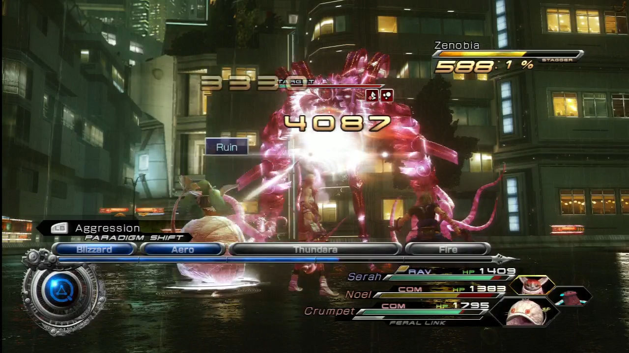 Dopo aver assistito ai filmati introduttivi e aver dato uno sguardo al tutorial è arrivato il momento di inizare a giocare sul serio! Siete nel covo del NORA, aprite la porta di fronte a voi, scavalcate gli ostacoli e dirigetevi verso l’uscita. A questo punto dopo un breve combattimento, a conclusione di un filmato, il vostro obiettivo sarà quello di sconfiggere tutti i mostri sulla spiaggia. Saranno 4 differenti battaglie! Incamminatevi, quindi, verso i Necton e i Meiobenthos – alla sinistra di Serah. Combattendo contro questi ultimi potrete usufruire, inoltre, di un tutorial sul cambio di optimum. Impostando l’optimum Carica Distruttiva, sconfiggere questi avversari sarà un gioco da ragazzi.